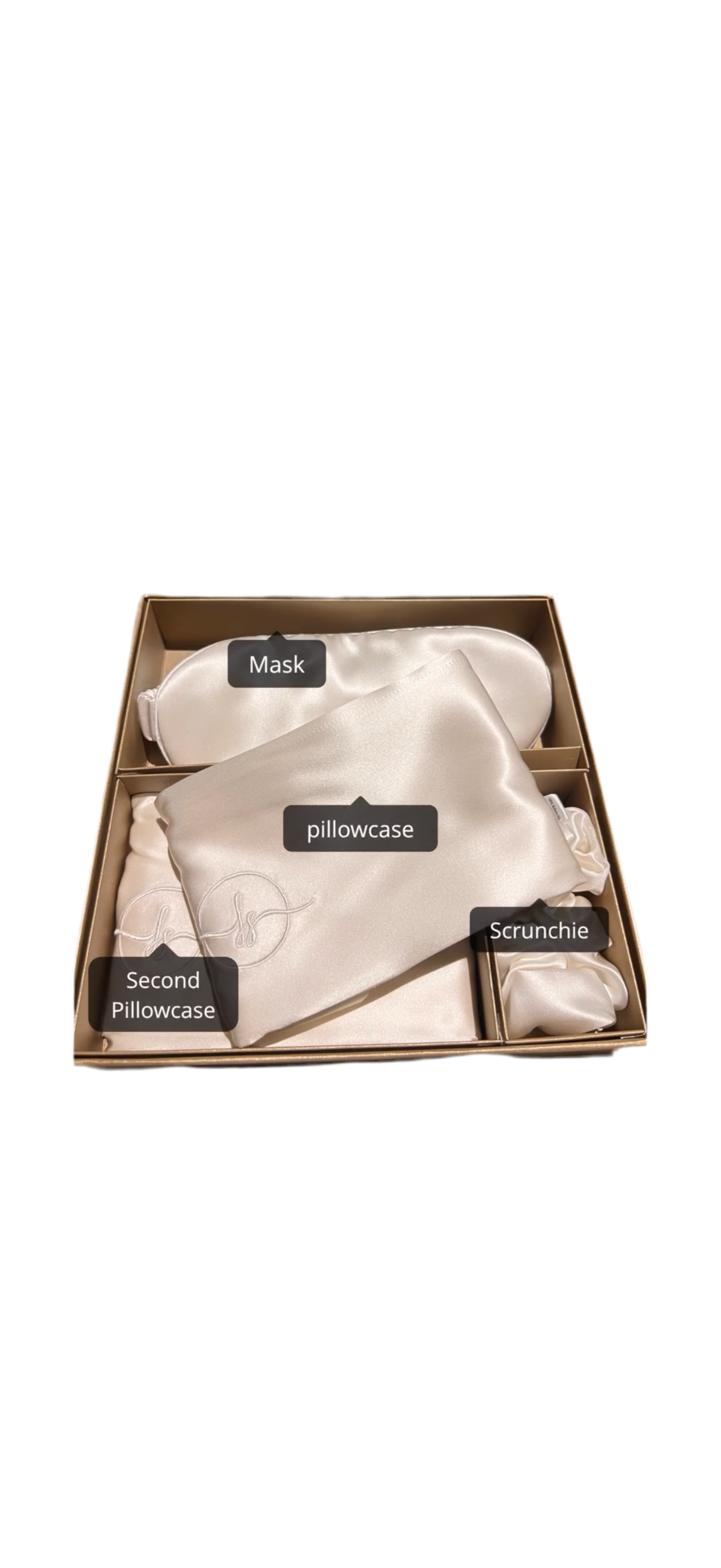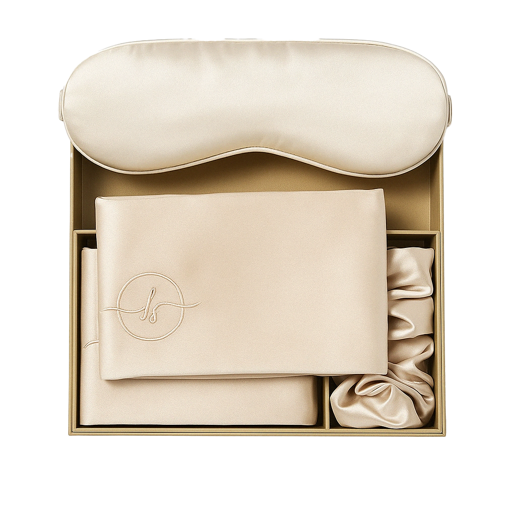 The Le Soie Royal Set is your complete silk beauty ritual. Each item is made with 100% pure Mulberry silk, offering unrivaled softness and benefits for skin, hair, and sleep quality. A curated gift of refinement and rejuvenation.
